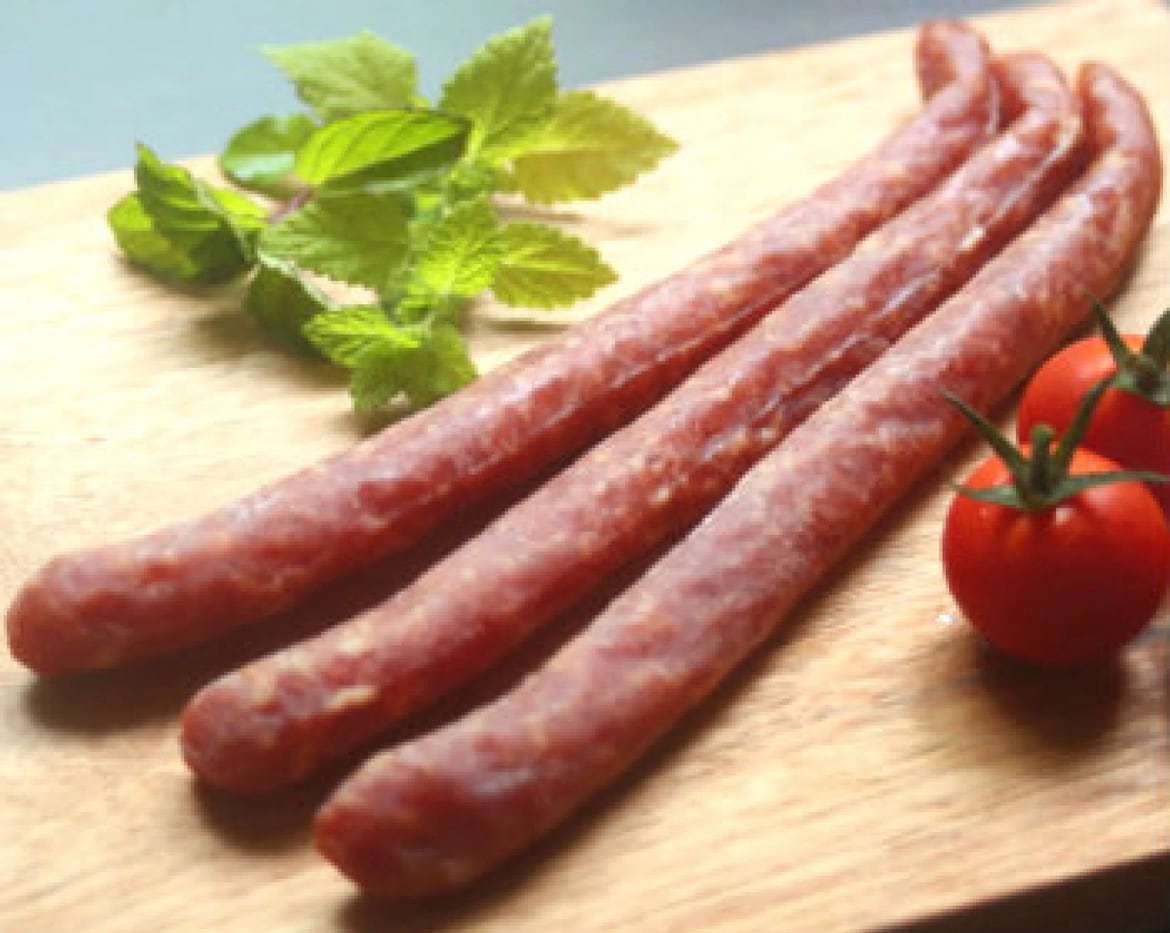 赤身の多いハム材料で作った生ソーセージの意。